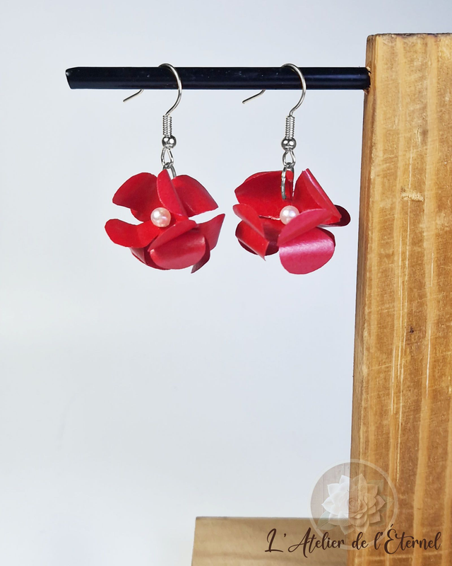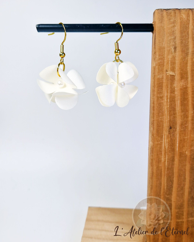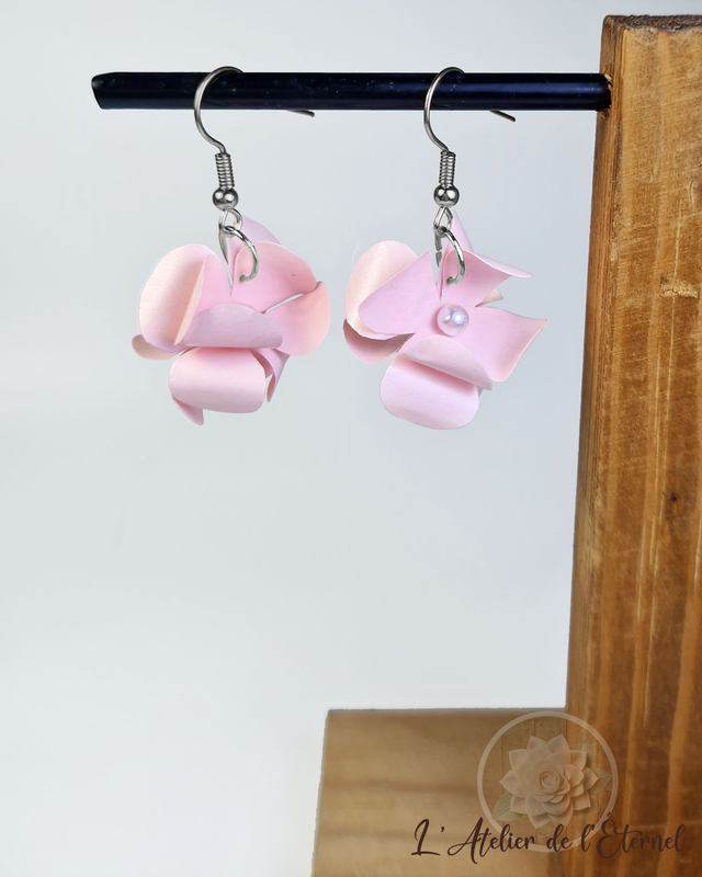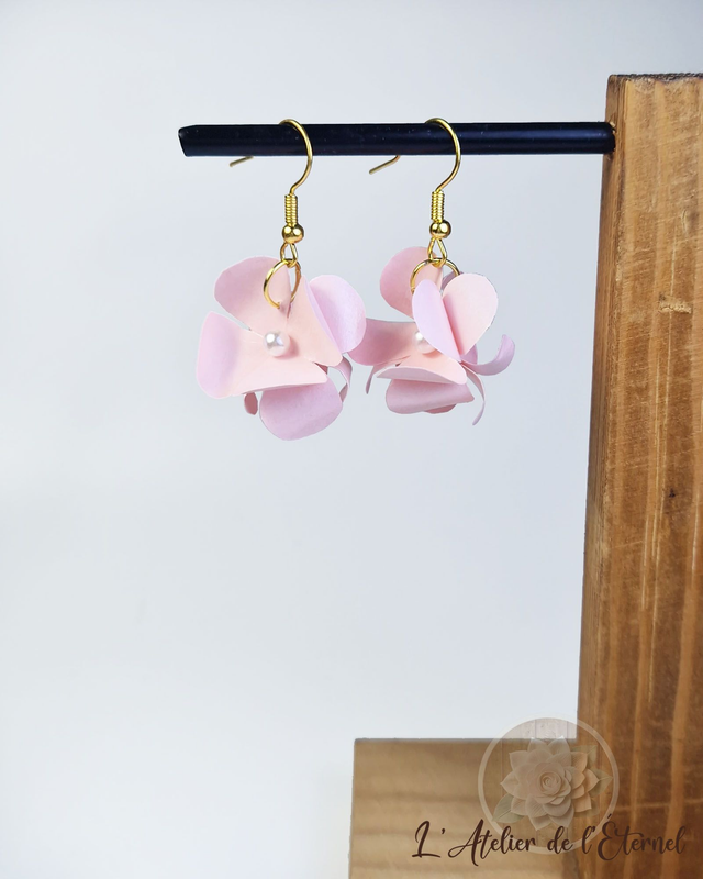 Inspirées de la fleur d’hortensia, ces boucles d’oreilles en papier se distinguent par leur élégance, leur légèreté et leur confort.