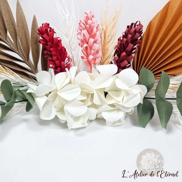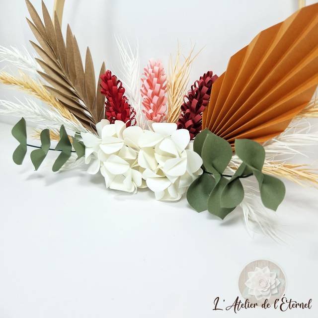 Pensé pour être parfaitement assorti au bouquet de la mariée, ce cerceau fleuri apporte une belle continuité visuelle entre la mariée et ses demoiselles d’honneur. Il reprend l'esprit bohème pour une harmonie délicate le jour du mariage.