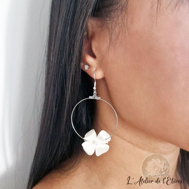 Complétez votre tenue de mariée avec ces boucles d'oreilles créoles hortensia, parfaitement assorties au bouquet de mariage de la même collection. Confectionnées à la main avec soin, elles allient élégance et légèreté pour une touche florale harmonieuse et raffinée.