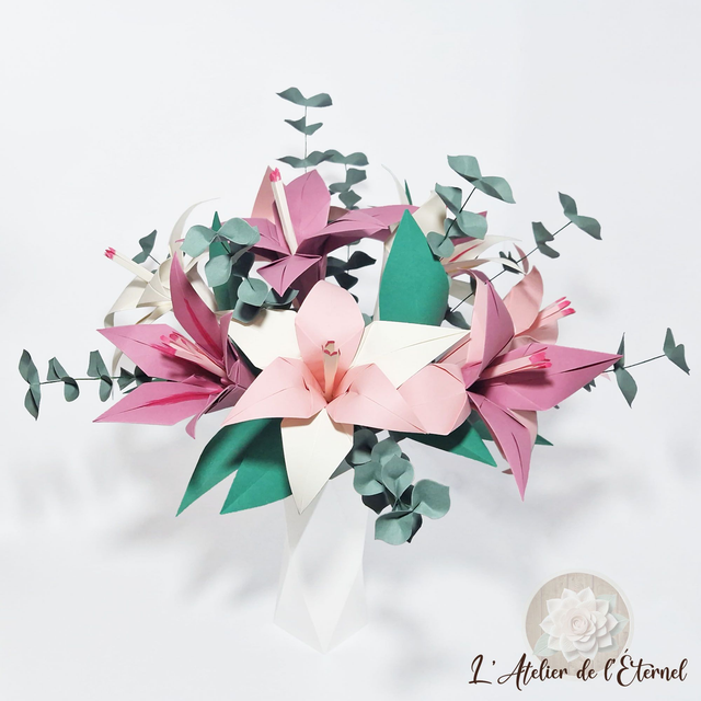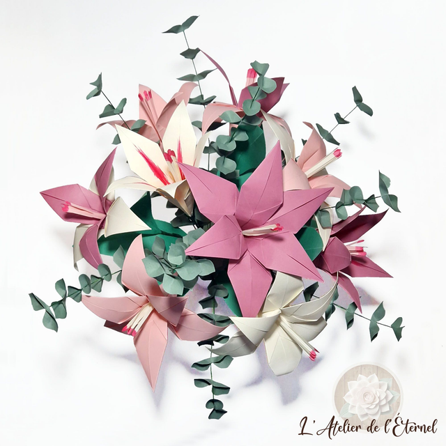 Un bouquet généreux et élégant, composé de 9 lys en origami aux tons doux de rose et de blanc. Il est accompagné de 9 branches d’eucalyptus et de 9 feuilles longues, pour une composition bien garnie, harmonieuse et pleine de fraîcheur.