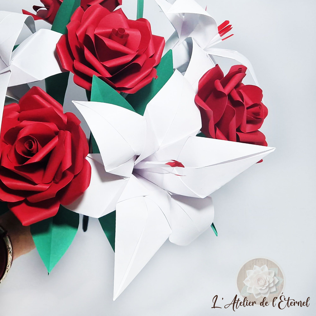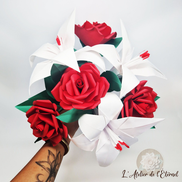 Découvrez ce bouquet d’exception, composé de 7 grandes fleurs : 4 roses rouges éclatantes et 3 fleurs de lys blanches pures, délicatement ornées de feuilles vert sapin pour une touche de fraîcheur et d’élégance.