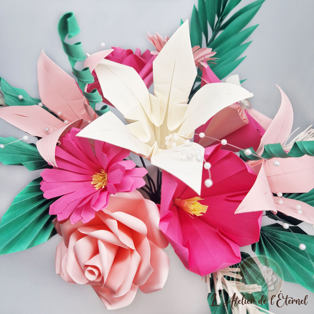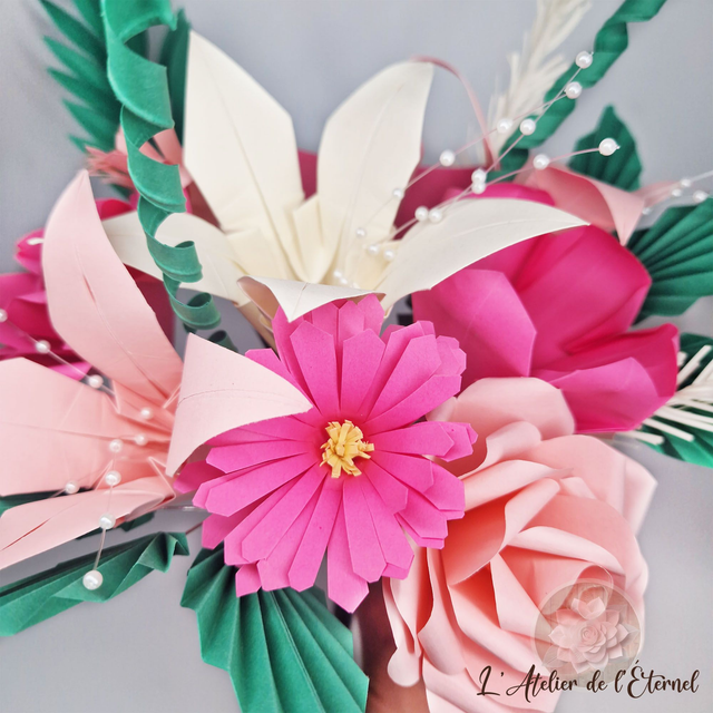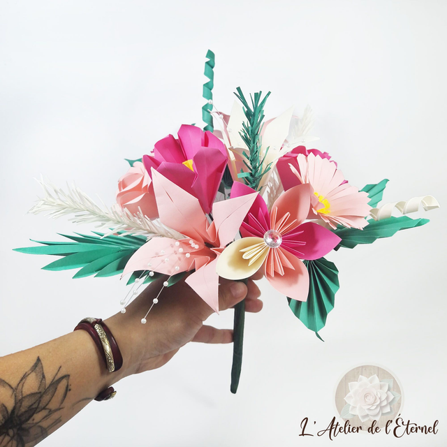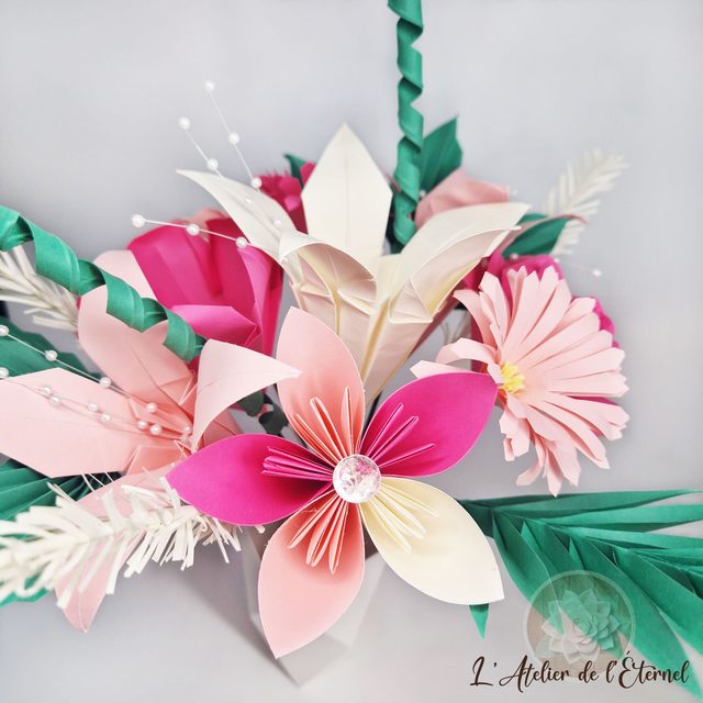 Laissez-vous séduire par ce bouquet en origami contrasté, composé de 9 fleurs délicates dans des nuances de rose et d’ivoire, sublimé par de raffinés accessoires vert sapin et ivoire.